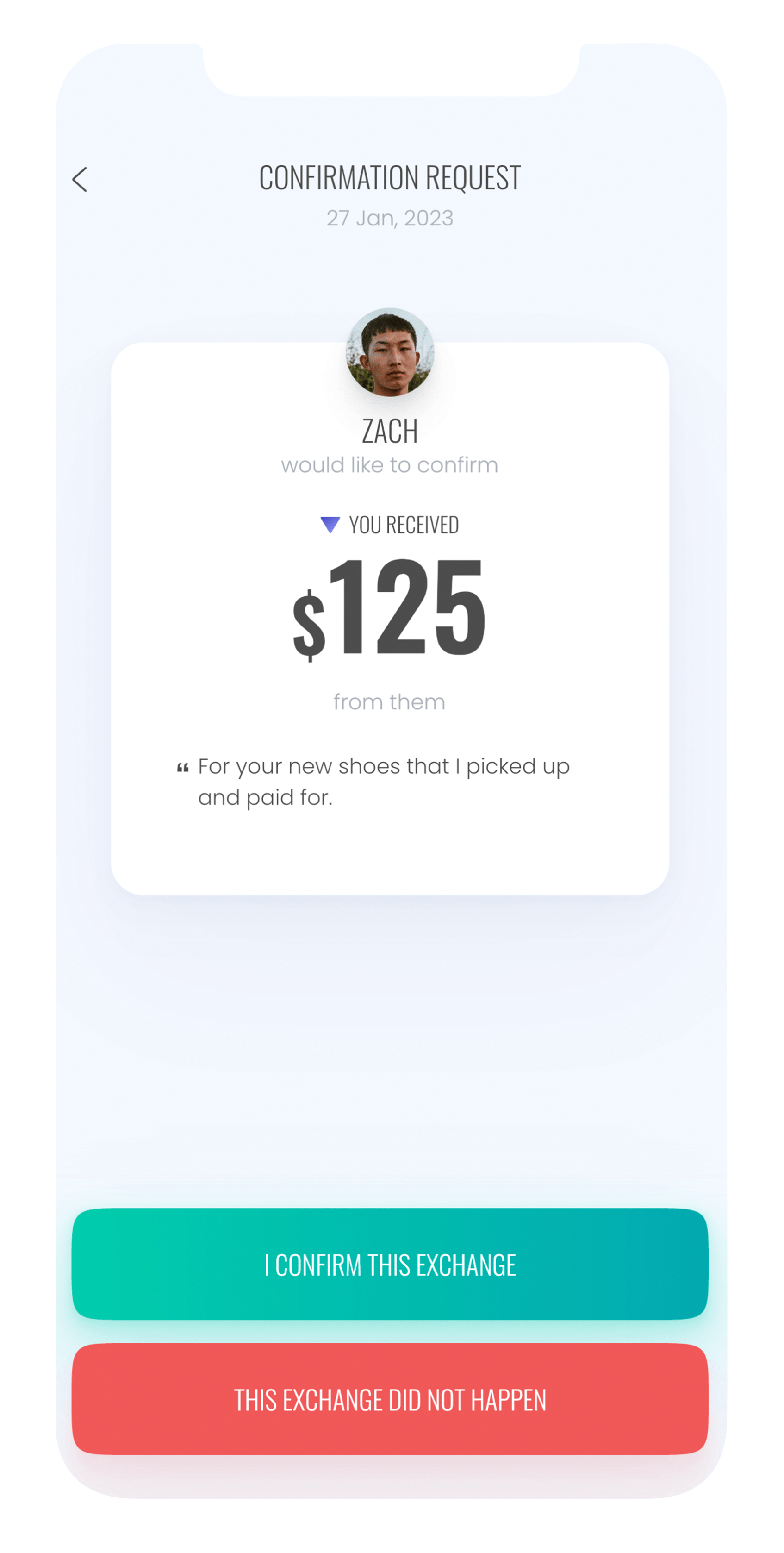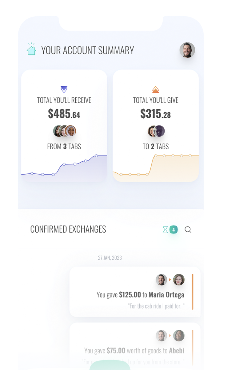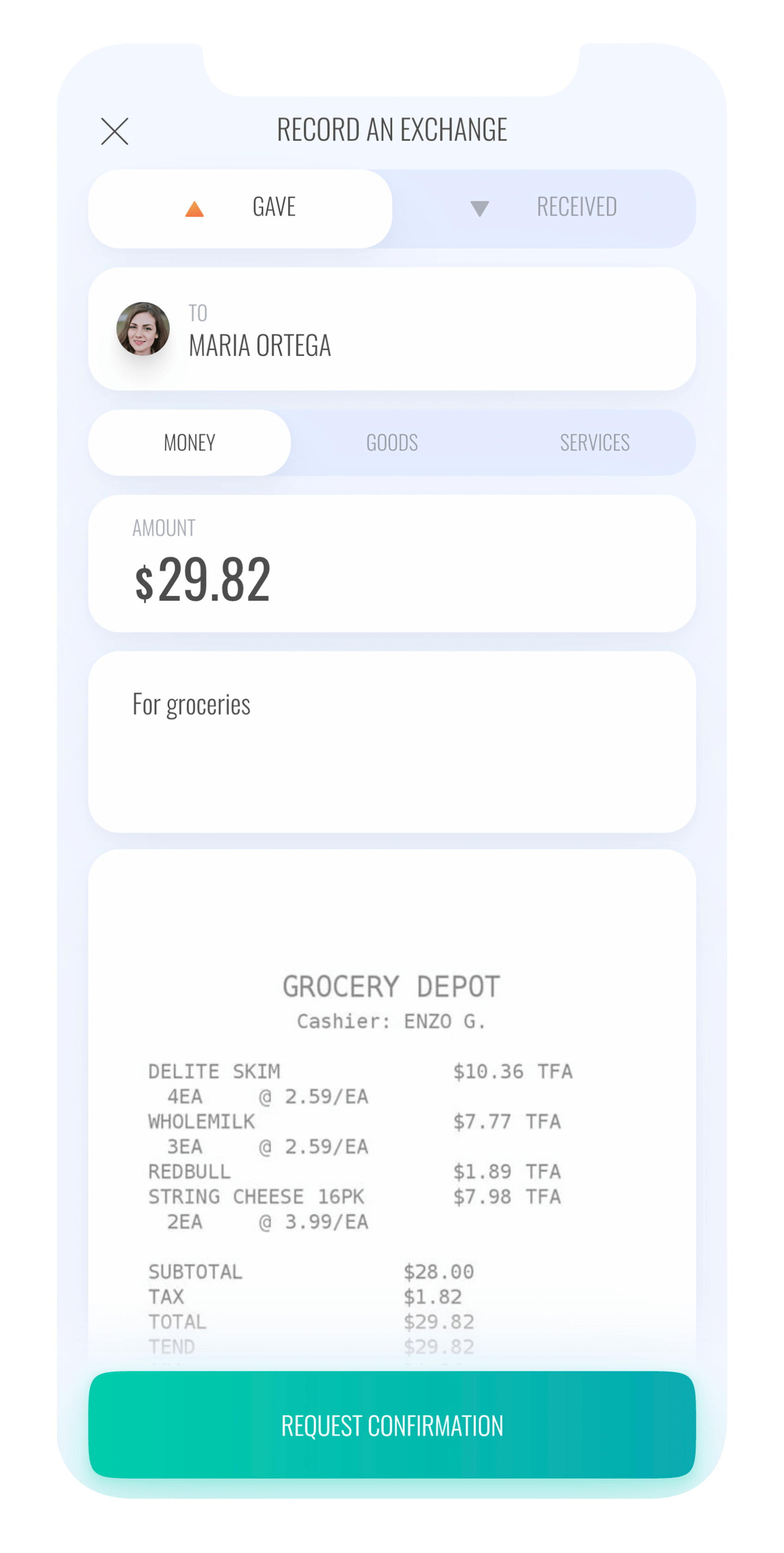 You gave your friend some cash, and you’ll need to get it back. Use Tabz to record the exchange. All exchanges are mutually confirmed with your friend, so later there is never any doubt about the amount.